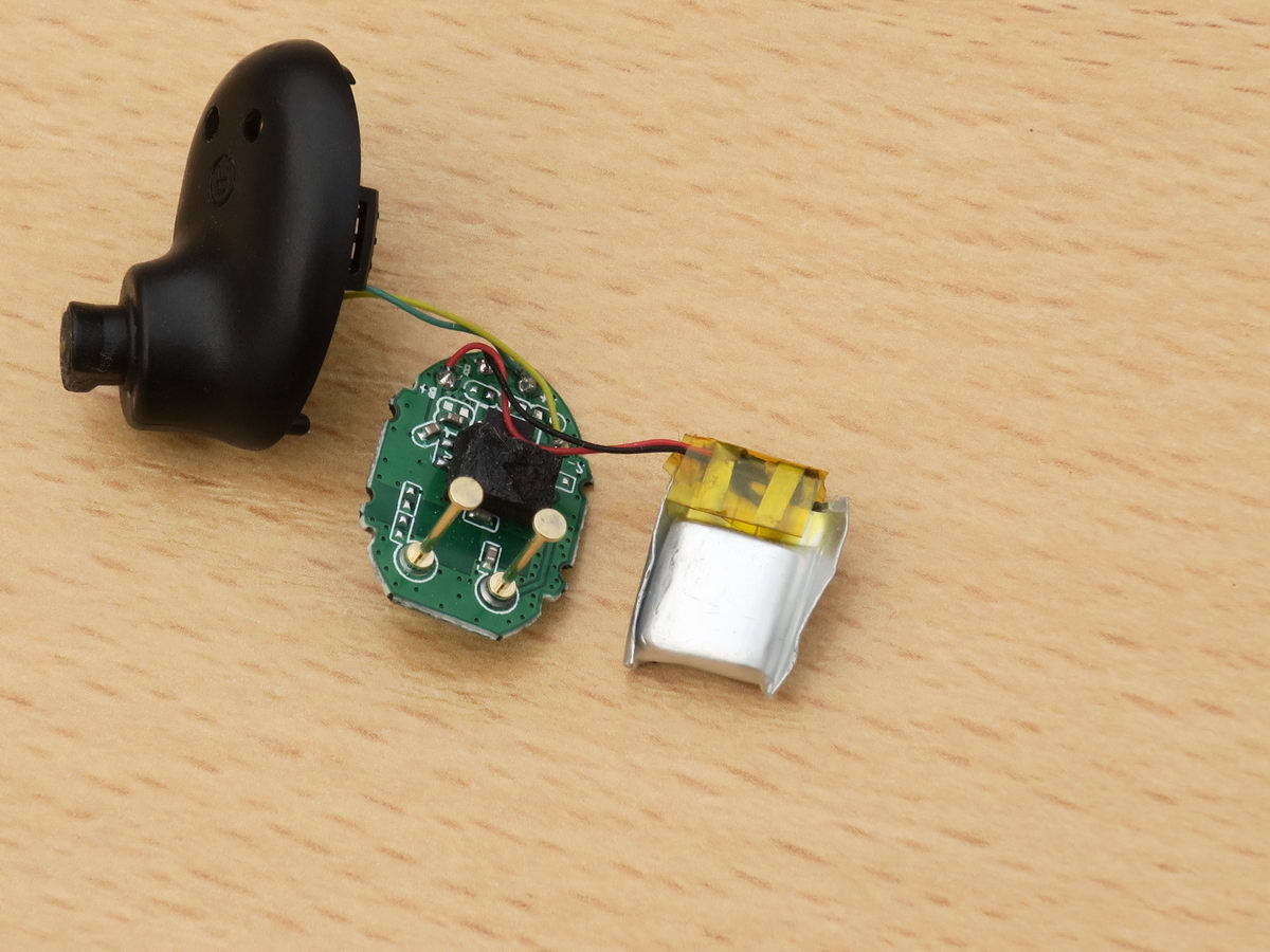 Всё, наушники отремонтированы. На следующем фото - припаянный новый аккумулятор, а внизу лежит старый: