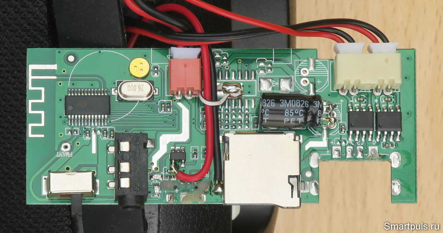 Слева расположена многоногая микросхема с логотипом то ли A3, то ли AB. Это - Bluetooth приёмник и дешифратор файлов с флешки и карты памяти.
