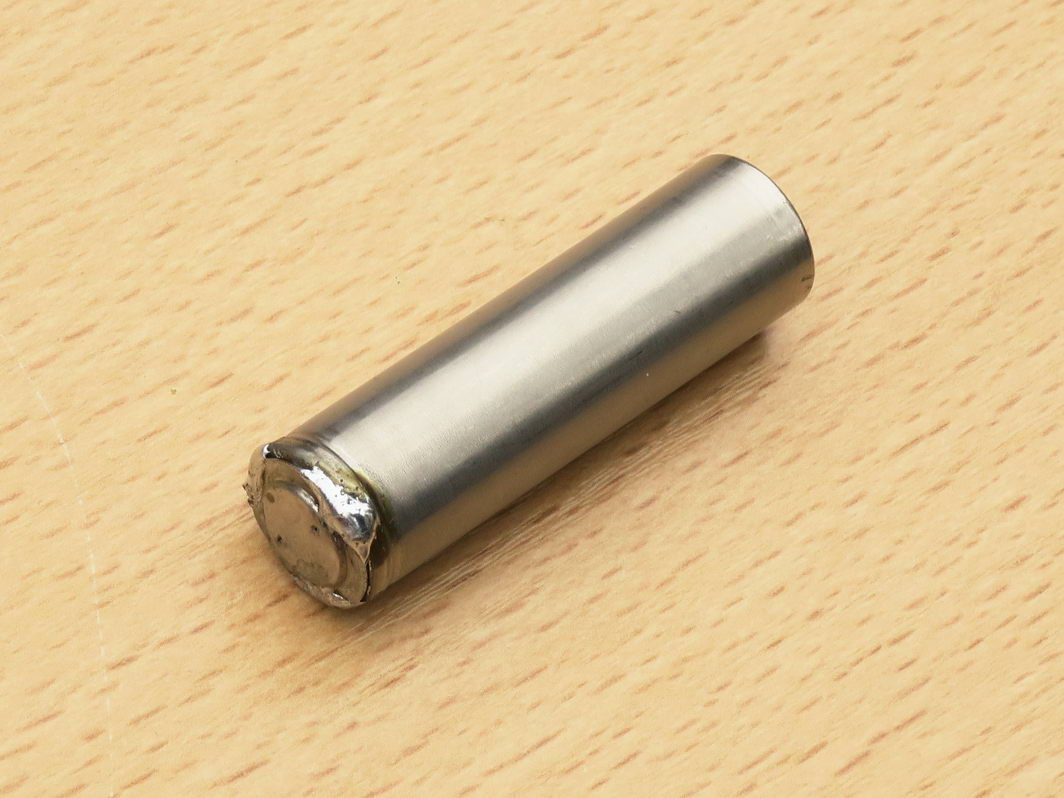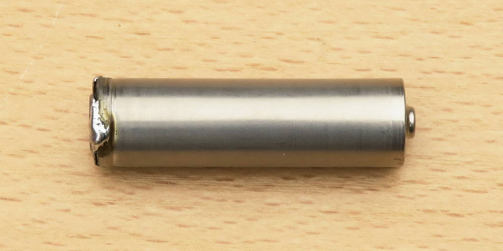 Была взята подлинная алкалиновая батарейка Duracell (израсходованная), из неё вынуты все "потроха", а крышка отрицательного электрода просто припаяна в трёх местах к корпусу батарейки (который одновременно являлся положительным электродом).