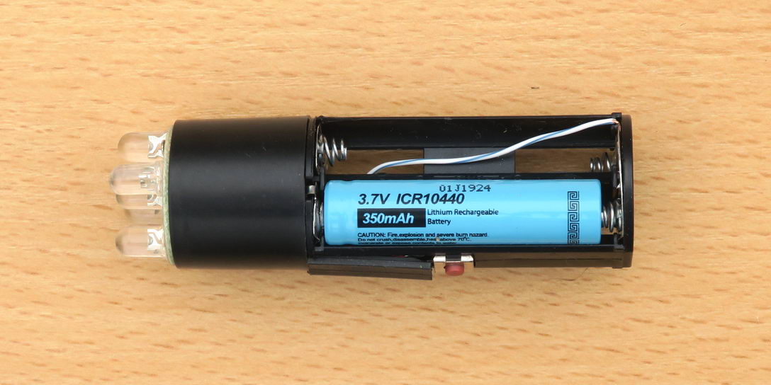 Внутри фонаря расположена кассета с электроникой и светодиодами, в которую устанавливаются 4 батарейки AAA. Поскольку в кассете все установочные места для батареек хорошо доступны, то поступаем точно так же, как и с мультиметром: устанавливаем аккумулятор, а "лишние" установочные места для батареек замыкаем проволочкой: