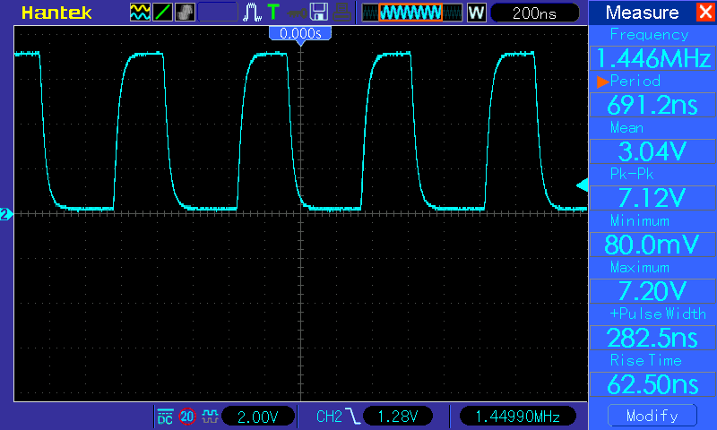 Частота преобразования оказалась около 1.45 МГц, что несколько выше обещанной (1.2 МГц), но не настолько, чтобы это как-то отражалось на функционировании.