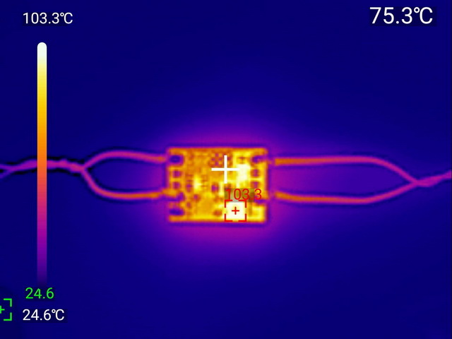 Максимальная температура на плате составила 103 градуса - это довольно много, но плата смогла долго работать в таком режиме, так что проблем нет.