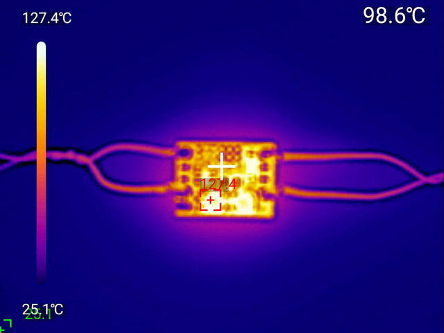 Температура на плате повысилась до 127 градусов! Это - уже точно перебор, дальше детали начнут отпаиваться сами собой. Самой горячей деталью оказалась левая индуктивность; затем, с небольшим отставанием - правая индуктивность и диод.
