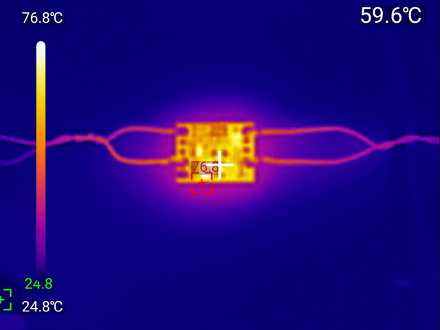 Снижение мощности нагрузки сказалось благотворно на тепловом режиме преобразователя: температура составила всего лишь 77 градусов. Самым горячим элементом осталась левая индуктивность.
