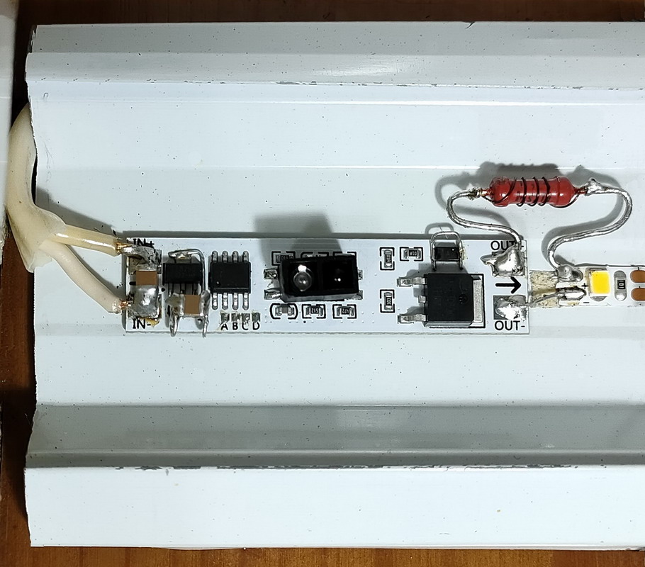 толстые проводники на выходе. 4. Сборка светильника с сенсорным выключателемПосле подготовки основы светильника все остальные операции делаются очень легко. Приклеиваем к основе светодиодную ленту с помощью её собственного клейкого слоя. Дополнительно я в трёх местах капнул прозрачный клей таким образом, чтобы он одновременно попал и на ленту, и на основу. Возможно, это делать не обязательно, но я подстраховался. Затем приклеиваем рядом с лентой на хороший клей плату с сенсорным выключателем. В качестве клея я использовал термостойкий силиконовый клей (до 343 градусов), купленный давно для ремонта светодиодных ламп. Купить его можно на Яндекс.Маркет. Реклама. ООО "Яндекс" ИНН 7736207543 Но данном случае высоких температур нет, и можно купить силиконовый клей подешевле (но всё равно термостойкость должна быть не менее 100 градусов). Затем соединяем плату сенсорного выключателя со светодиодной лентой и кабелем питания, и вуаля: Закрепление получившегося светильника на месте установки осуществляем, исходя из местных условий. Рассеиватель на основу светильника я надевать не стал, так как светильник питается безопасным напряжением 5 В с гальванической развязкой от сети. Для ванной комнаты и других мест с повышенной влажностью такая конструкция, видимо, не подойдёт (конденсация влаги на открытых контактах может привести к коррозии и гибели схемы; да и источник питания для работы в таких условиях не предназначен; плюс ко всему помещения с повышенной влажностью относятся к особо опасным). Если пользователь всё-таки захочет установить рассеиватель по эстетическим соображениям, то для работы инфракрасного сенсора необходимо будет сделать в нём либо одно большое отверстие, либо два поменьше.