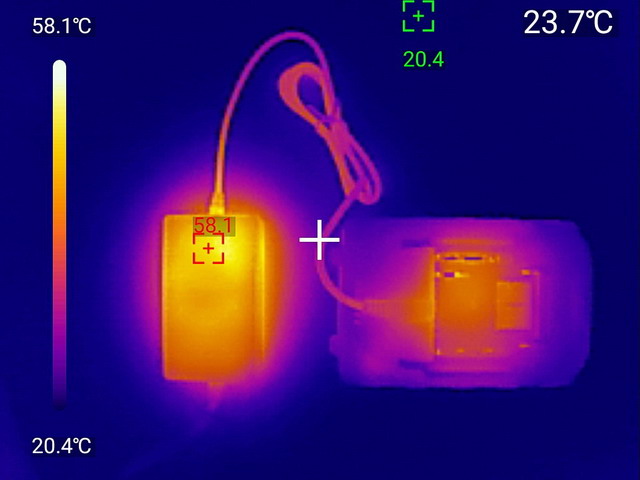 Тепловой снимок показал, что при зарядке аккумулятора нет перегрева ни заряжаемого аккумулятора, ни зарядного устройства.