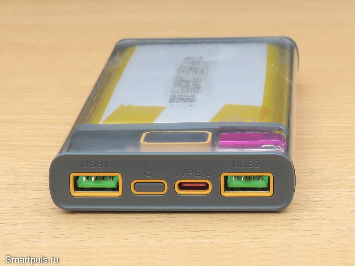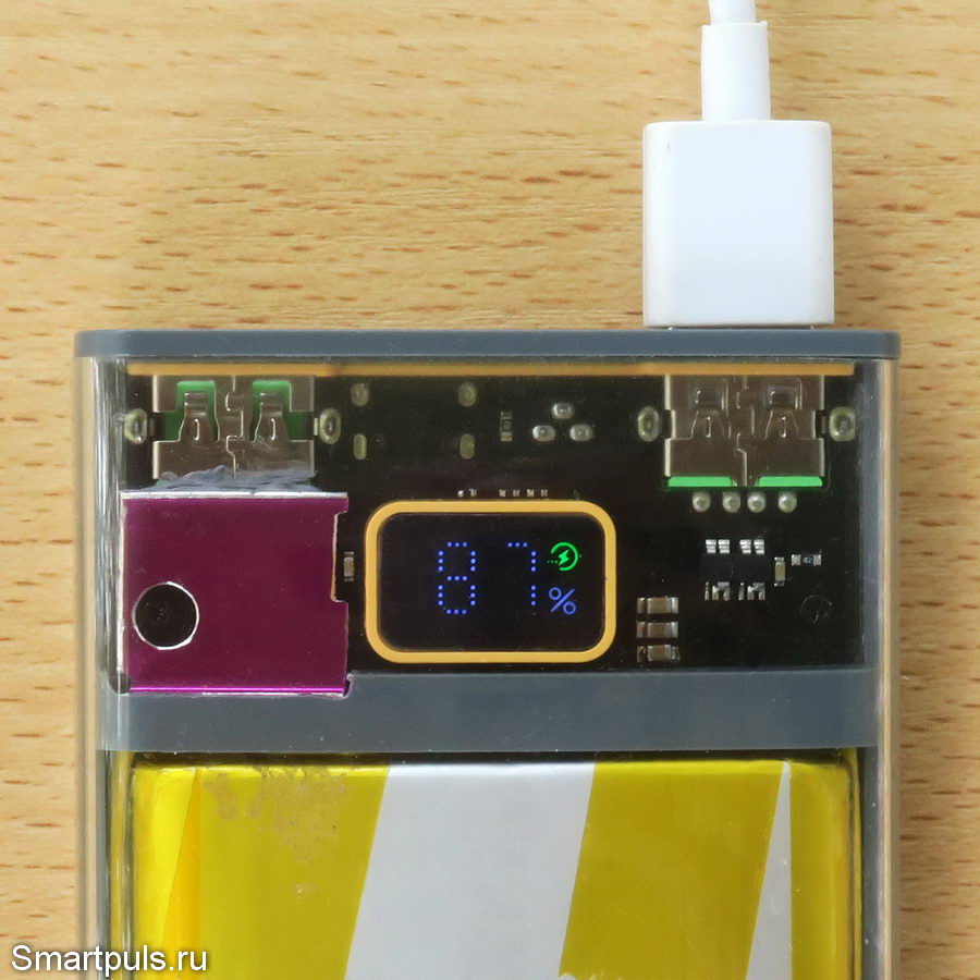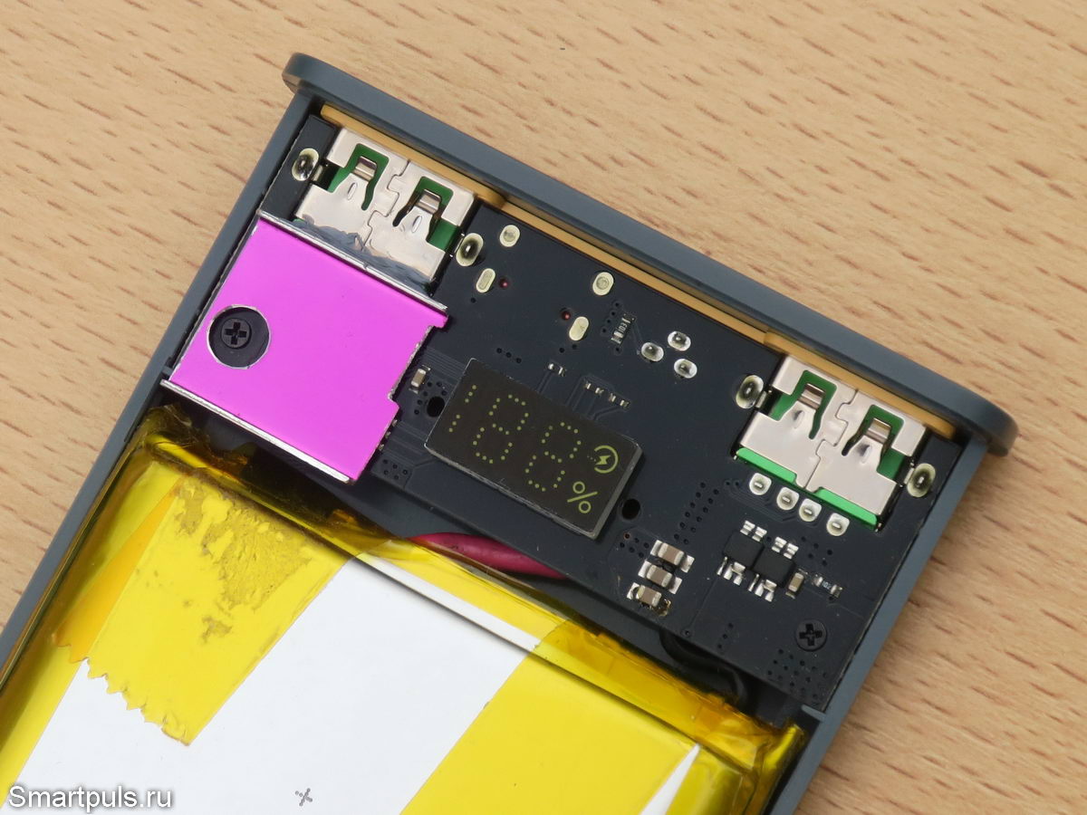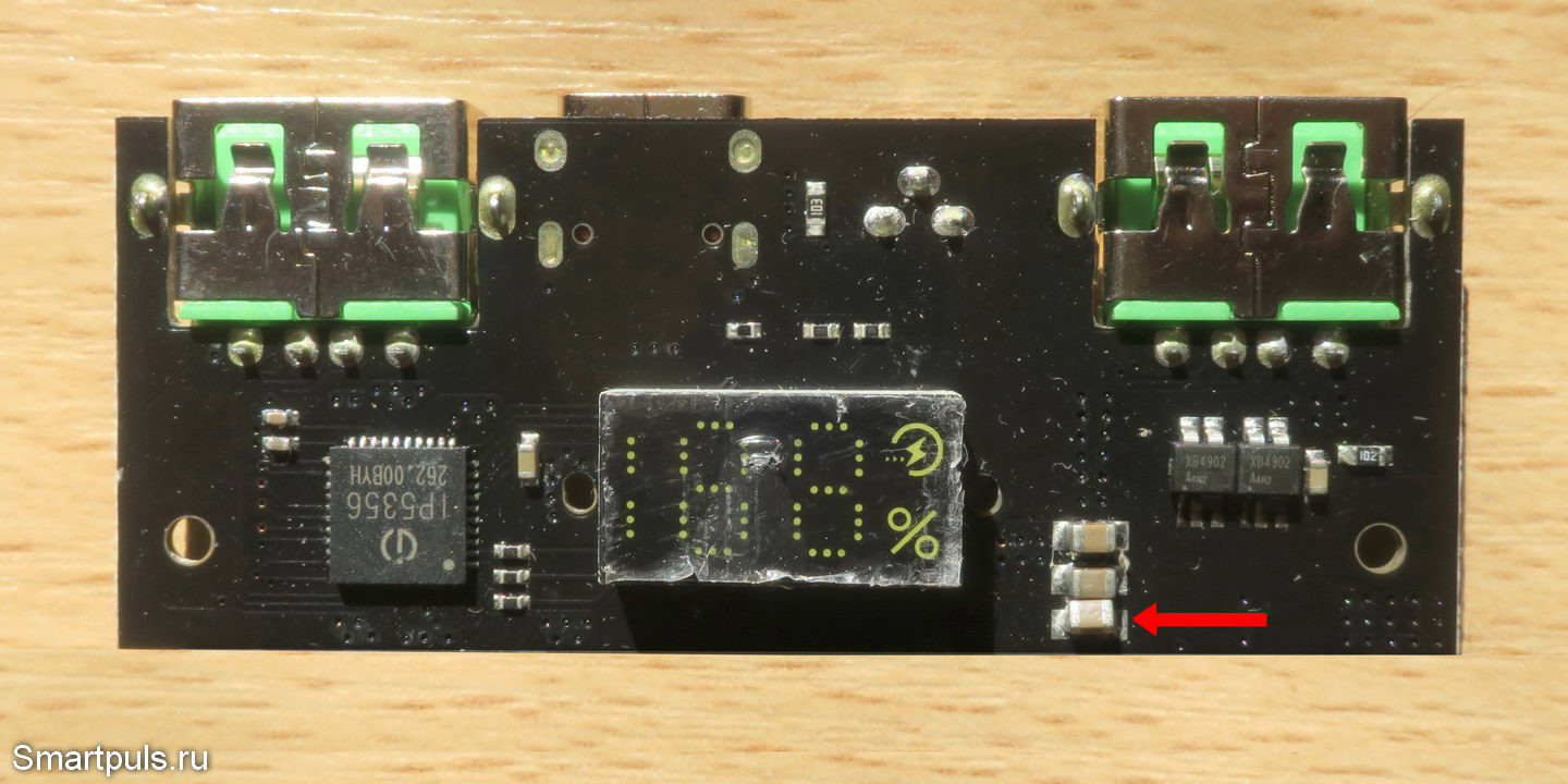 И, небольшой лайфхак к использованию этого повербанка. При зарядке от него других устройств подключать их лучше к тому USB-разъёму, который дальше от чипа контроллера. Это связано с тем, что USB-разъёмы при прохождении больших токов слегка разогреваются из-за контактного сопротивления, и пусть это тепло выделяется подальше от чипа, ему и так тяжело приходится!