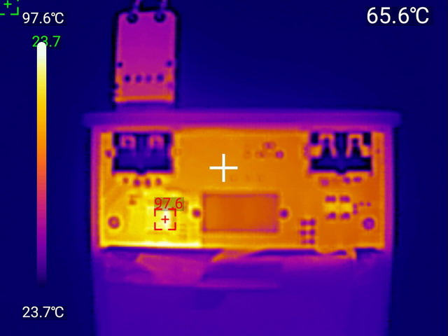 Чип контролера (IP5356) разогрелся до 97 градусов! При этом измерении крышка повербанка не была надета, а с надетой крышкой за счёт замкнутого пространства можно добавить ещё несколько градусов, т.е. будет свыше 100! Весело, правда же?! Кажется, разгадана загадка невысокой надёжности контроллеров повербанков - перегрев "главного" чипа!