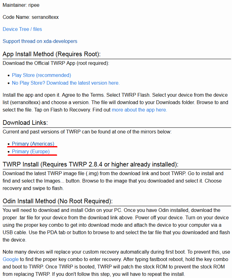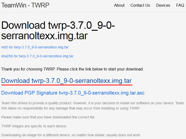 Попадаем, собственно, на страницу скачивания Рекавери. Ищем раздел “Download links”, кликаем по одной из ссылок, и попадаем на следующую страницу, где ищем самую свежую версию Рекавери с раширением *.tar, и кликаем по ссылке.