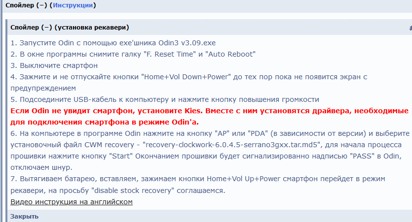 Инструкцию надо точно и последовательно выполнить, но вместо упомянутых в ней версий файлов Odin и Рекавери используем те, что ранее были скачены.