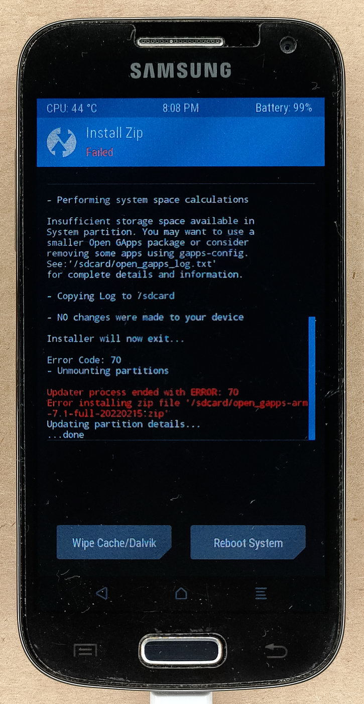 Тонкость: там есть несколько вариантов Gapps по количеству включённых в них сервисов Google. Я первоначально скачал полную версию, но она не установилась с ошибкой 70 (нехватка места в системном разделе):