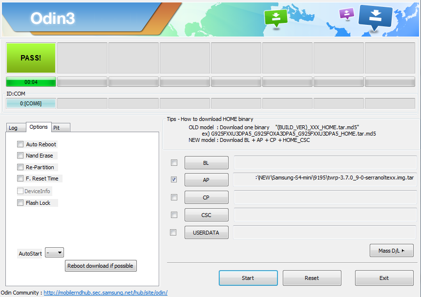 После запуска Odin с помощью кнопки AP подгружаем скаченный файл Рекавери, и не забываем зайти на вкладку Options и убрать галочки, указанные в инструкции. При успешном окончании процесса увидим подобную картину:
