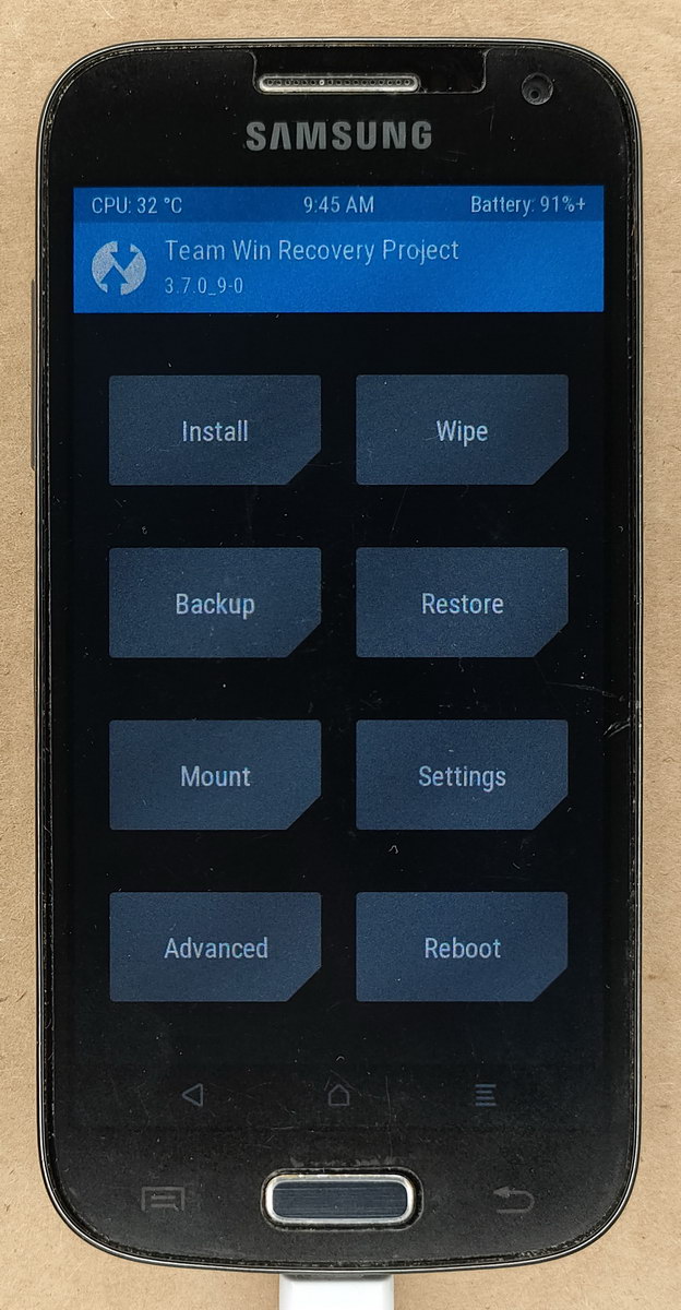 Так выглядит экран смартфона со стартовой страницей рекавери TWRP: