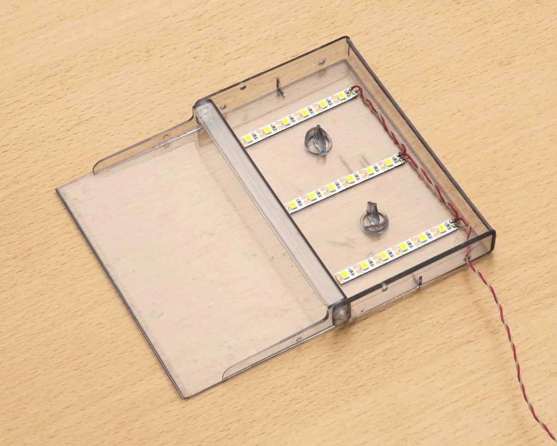 Светодиодную ленту приклеиваем несколькими полосками на внутреннюю сторону коробки от кассеты:
