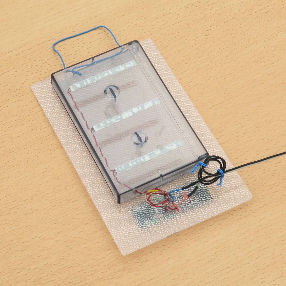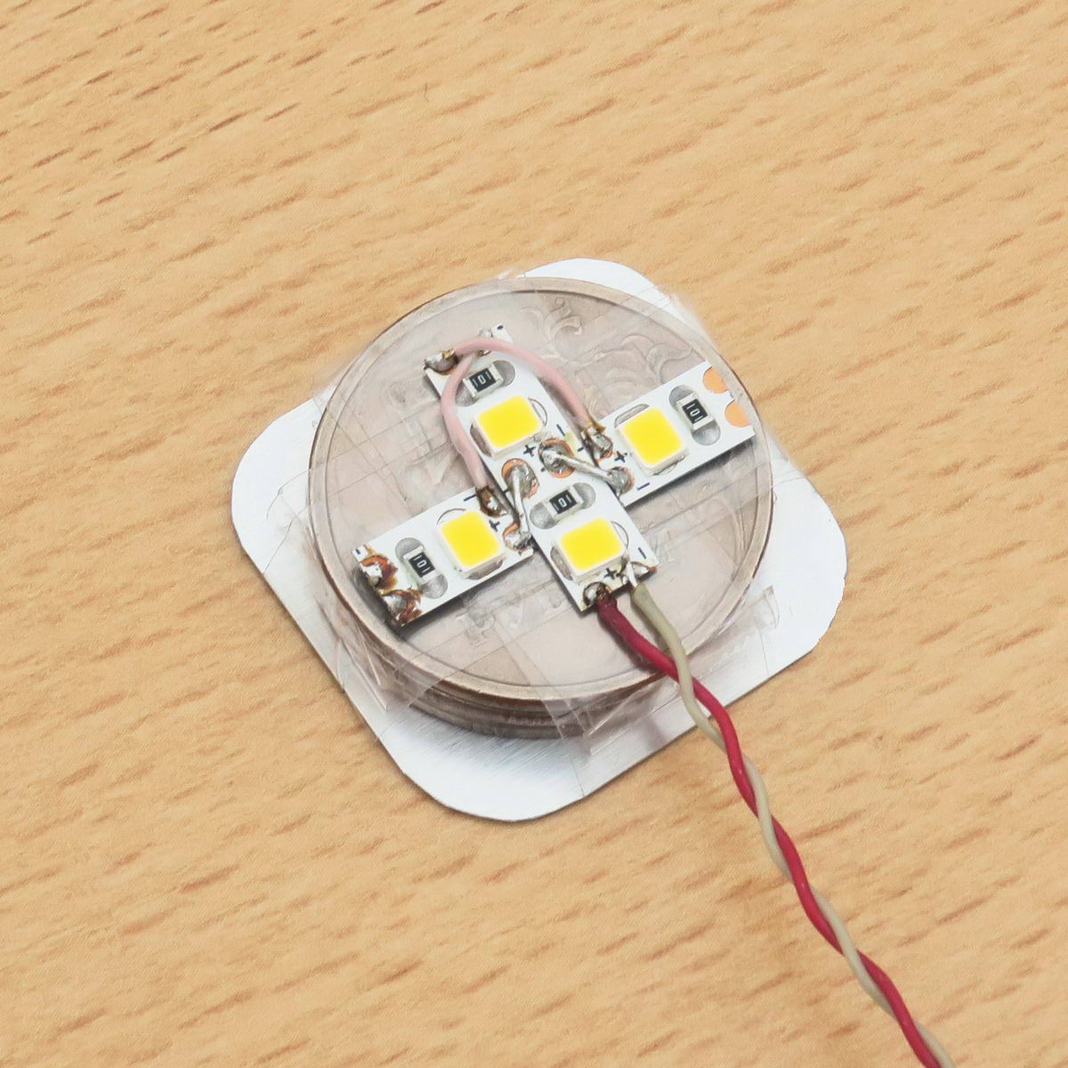 В качестве выхода я спаял ромбиком параллельно четыре светодиода из 5-вольтовой светодиодной ленты, наклеил их на плоский грузик, и положил на дно стакана.