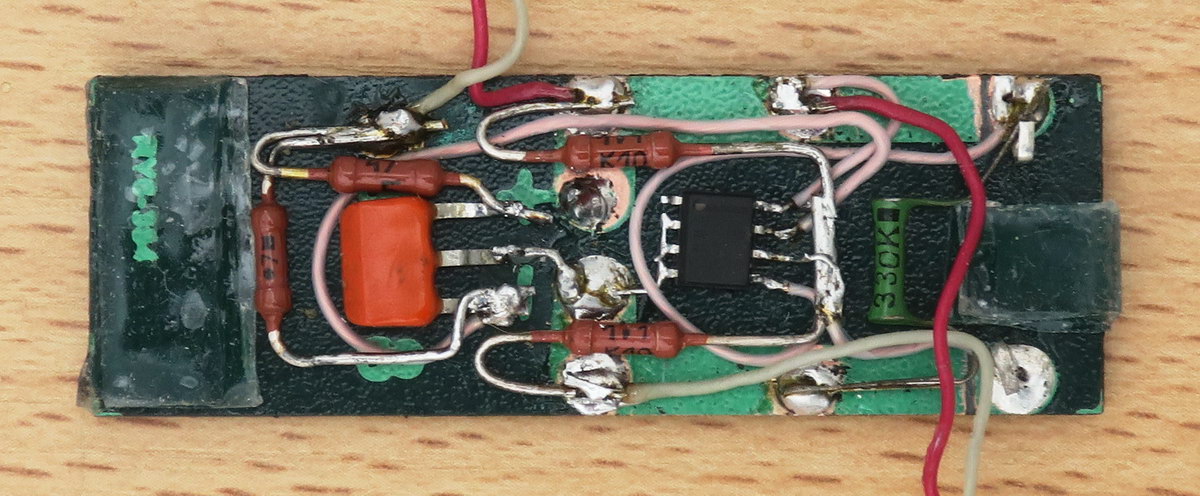 Но, чтобы порог срабатывания схемы по освещённости не изменился, номинал резистора R3 был повышен с 330 КОм до 910 КОм; а чтобы не изменилась мощность излучаемого света, номинал токозадающего резистора R5 был повышен с 47 Ом до 200 Ом.