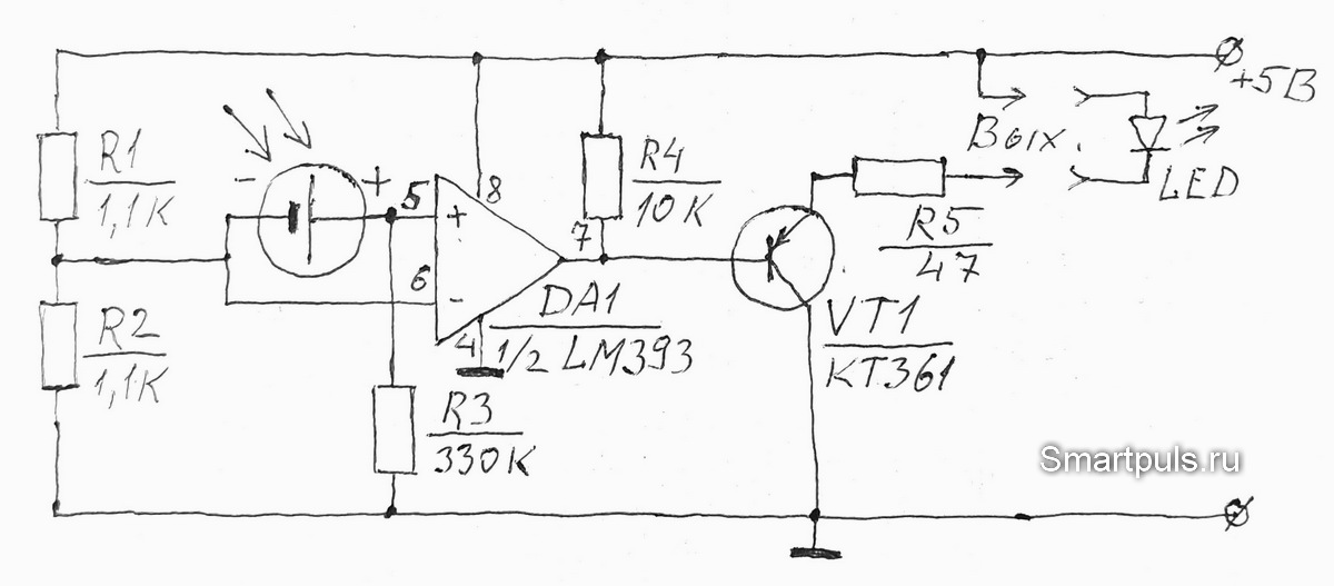 А вот, собственно, сама принципиальная схема управления ночником для напряжения питания 5 В (нарисована от руки, т.к. в программе рисовать было лень):