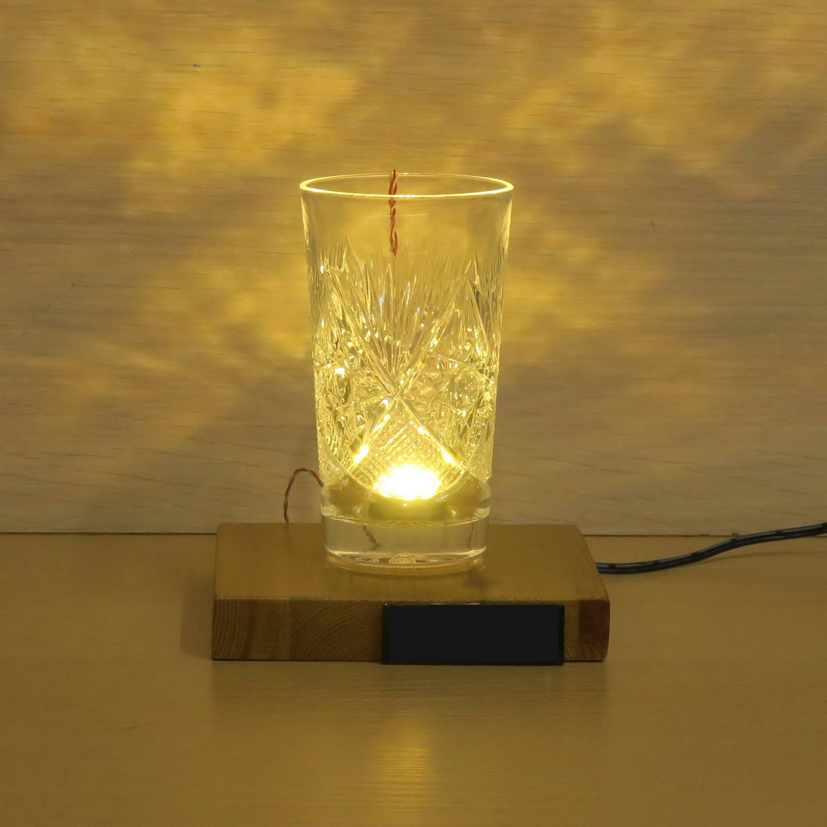 Ночник из хрустального стакана создаётся точно так же, как и самый первый из рассмотренных в этом материале ночников на основе цилиндра с матовой поверхностью. Для него точно так же потребуется деревянная подставка, к которой следует приклеить двухсторонним скотчем датчик освещения.