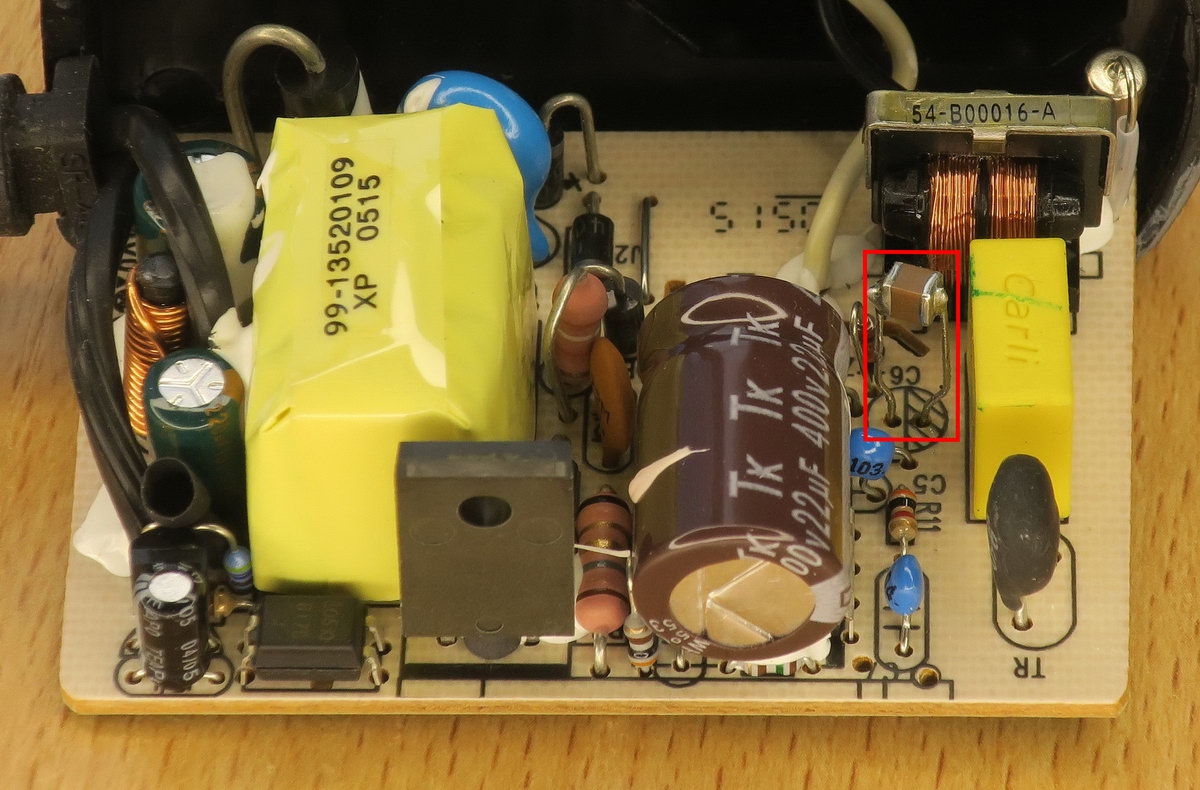 В качестве причины, почему блок питания успешно включился, несмотря на пониженную ёмкость конденсатора, можно снова назвать зависимость ёмкости от напряжения. Микросхема ШИМ этого блока питания US3843 включается при напряжении 8.4 В, когда ёмкость конденсатора заметно выше, чем при напряжении 10 В, что оказалось достаточным для включения; а последующее снижение ёмкости конденсатора уже не могло помешать работе микросхемы.