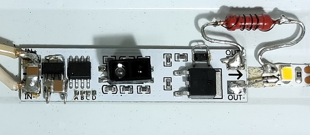 В данном конкретном случае из-за перехода платы сенсора с питания 12 В на 5 В пришлось исключить из схемы собственный стабилизатор 5 В на плате, что повысило требования к внешнему питанию. Сенсор использовался для создания кухонного светильника под шкаф с бесконтактным включением / выключением светодиодной ленты (статья об этом).